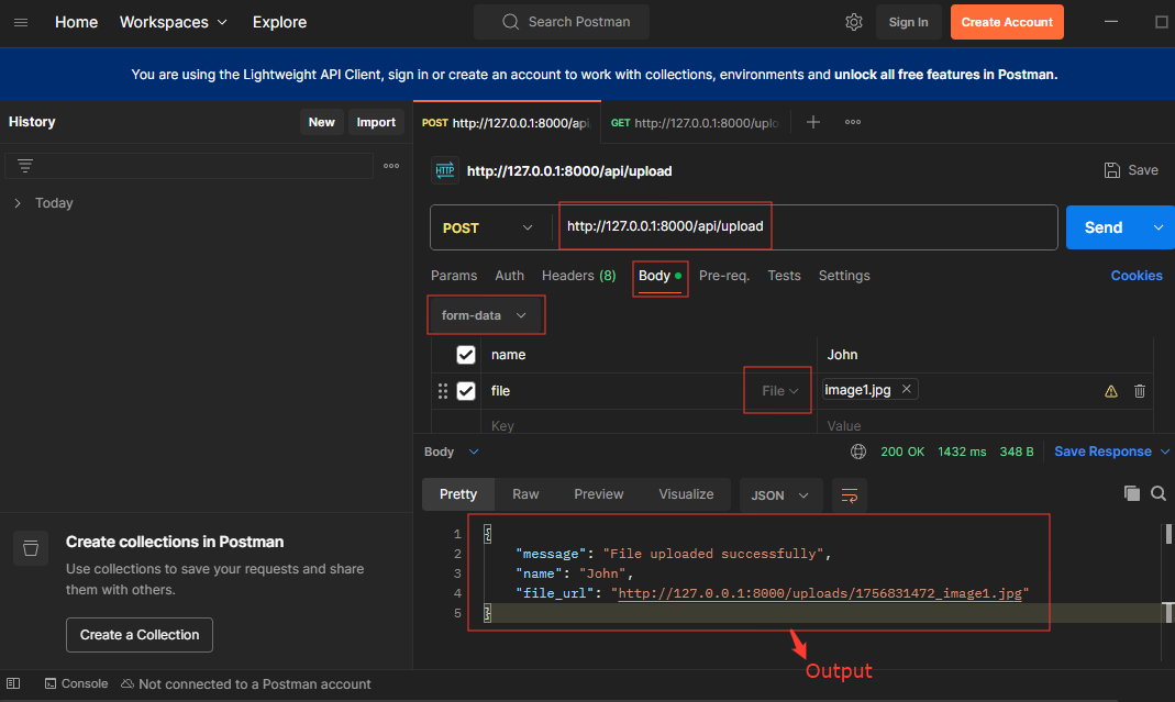 { "message": "File uploaded successfully", "name": "John", "file_url": "http://127.0.0.1:8000/uploads/1756831472_image1.jpg" }